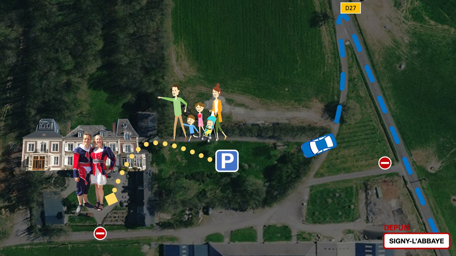 La voiture est à privilégier, ou alors en taxi depuis la gare de Charleville-Mézières. Garez votre voiture selon le plan ci-dessous, et rejoignez-nous devant le porche d'entrée du château :