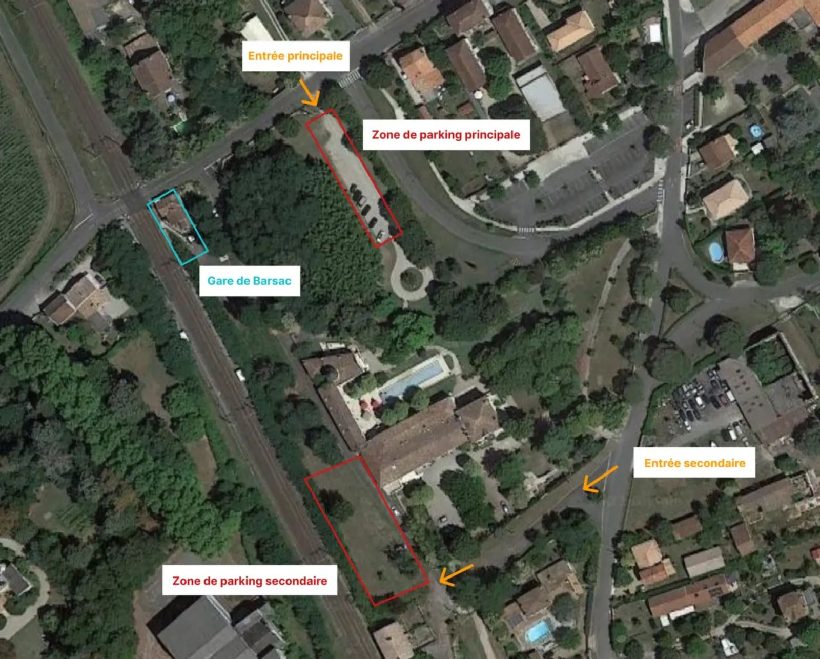 En cas de parking principal complet, un parking secondaire est disponible à l'arrière du domaine : en face du 20 Rue de la Gare, 33720 Barsac