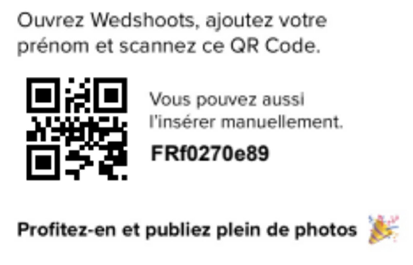 Après le vin d'honneur, nous comptons sur vous tous pour capturer les moments inoubliables de cette soirée, et grâce à ce QR code nous pouvons nous les partager.