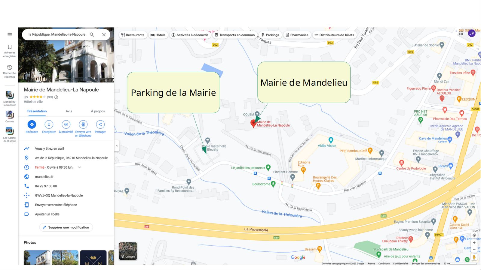 https://www.google.com/maps/place/Mairie+de+Mandelieu-La+Napoule/@43.542694,6.9293675,17z/data=!3m1!4b1!4m6!3m5!1s0x12ce832a3ccdd14b:0x397c77ed8fddb69c!8m2!3d43.542694!4d6.9319424!16s%2Fg%2F113dqpm3j?entry=ttu