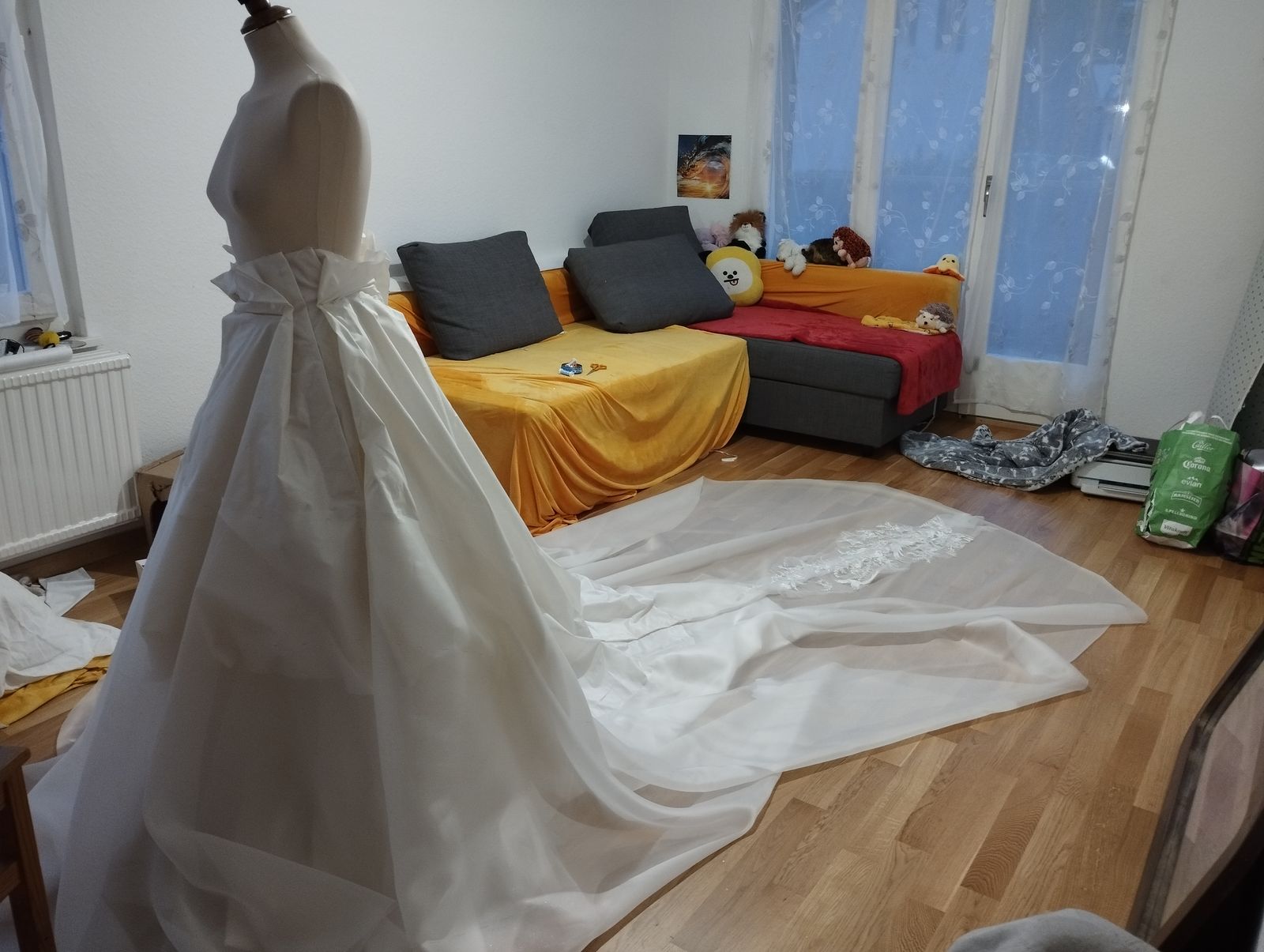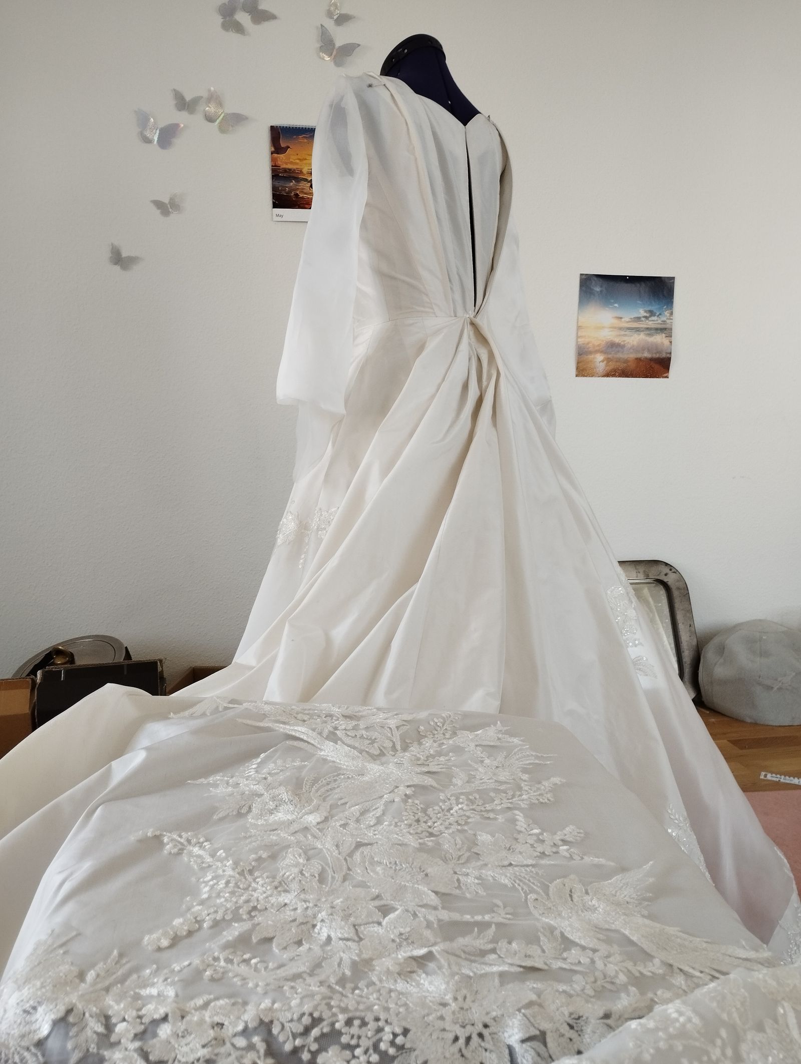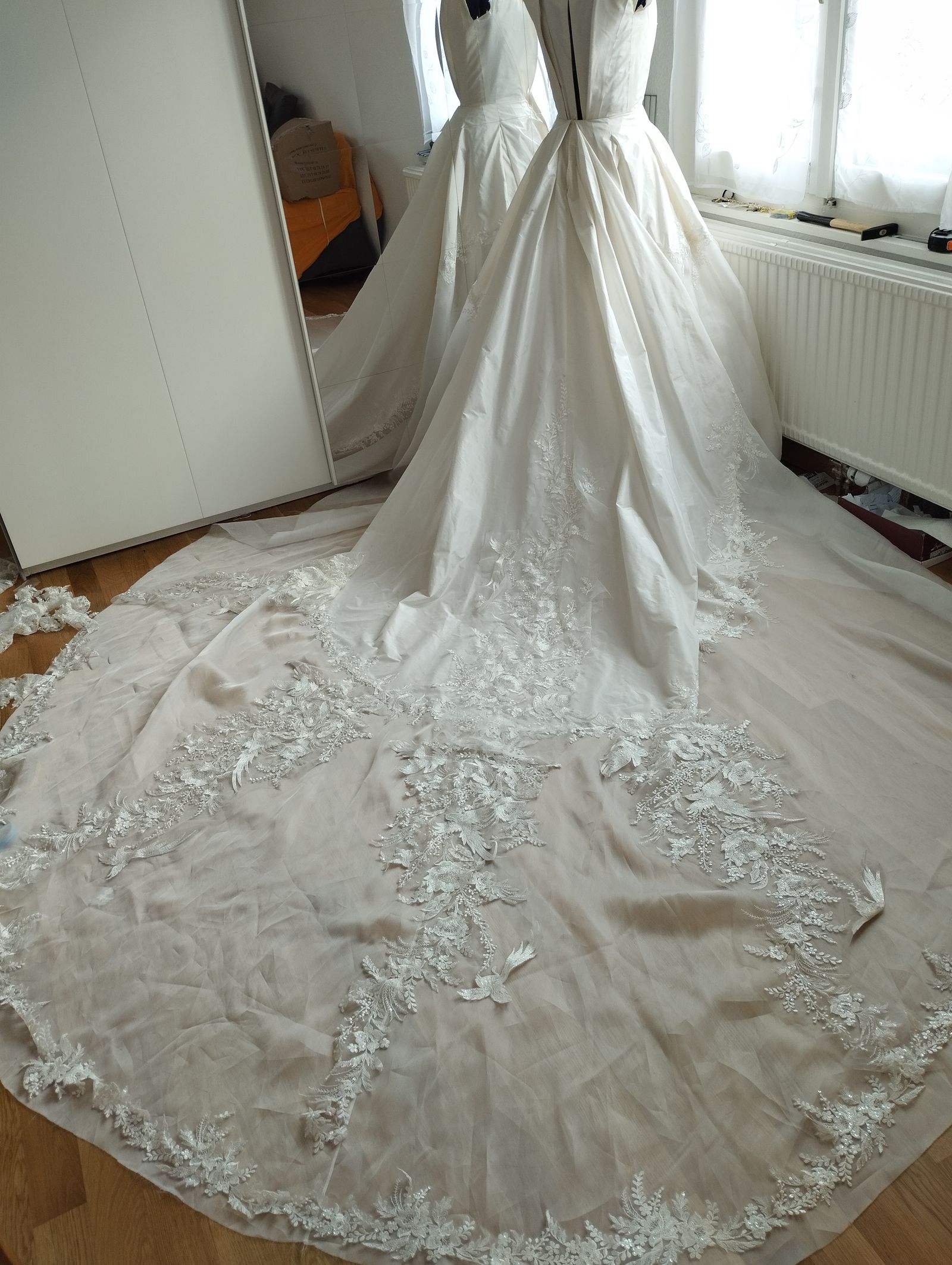 Avec Marion on a passé beaucoup de temps à faire des essais pour la disposition de la dentelle sur la traîne. Merciiiii de m'avoir aidée😘