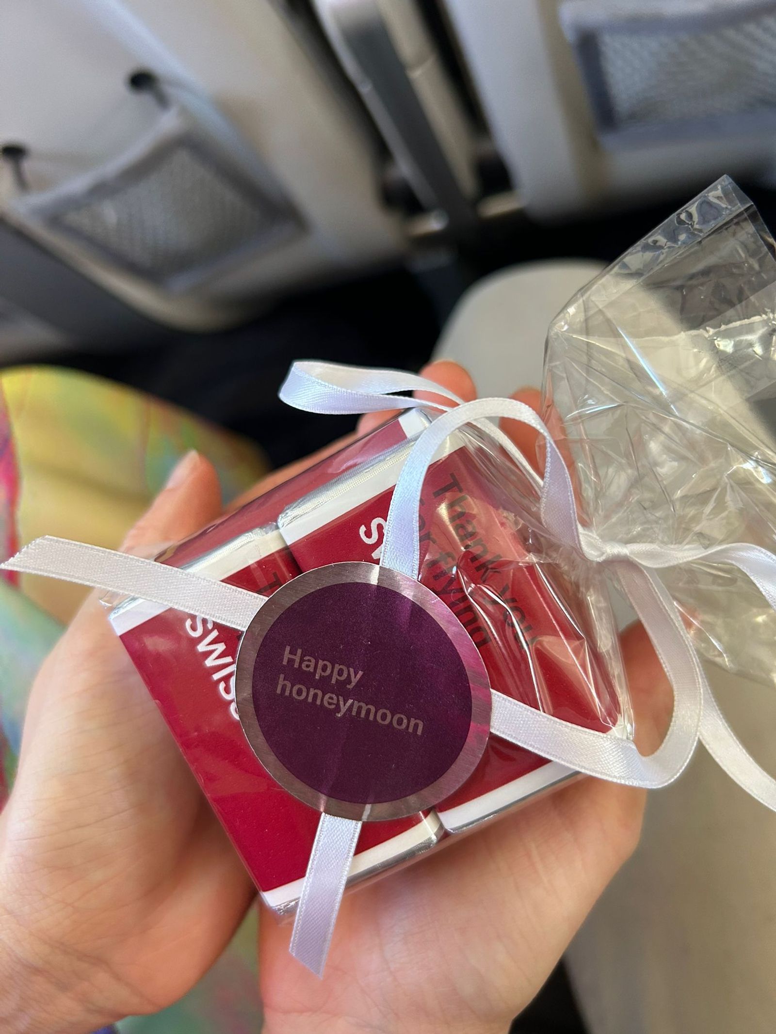 La compagnie nous a offert un petit cadeau tout spécial, ainsi que du champagne pour célébrer notre mariage. Nous avons fait un très bon vol avec la belle surprise d'être dans le même avion que Jean-Pierre et Florianne !