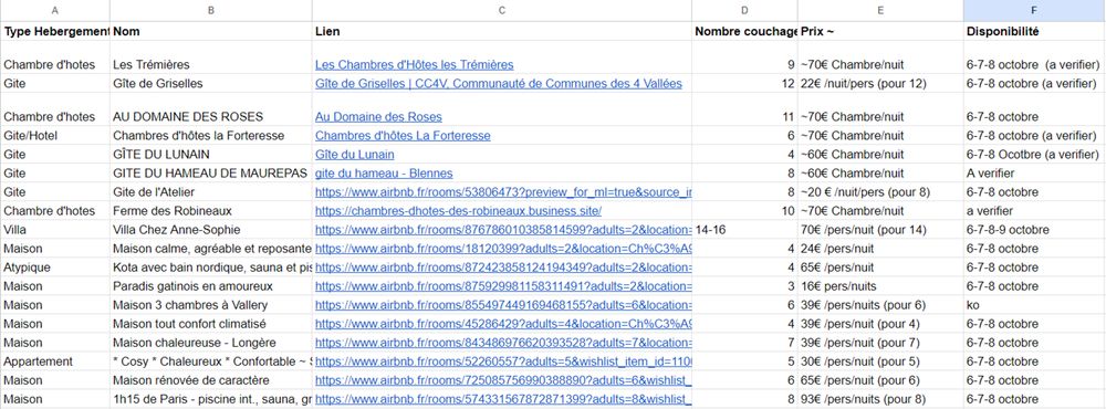 Vous trouverez dans cet excel une liste de gites/chambre d'hotes